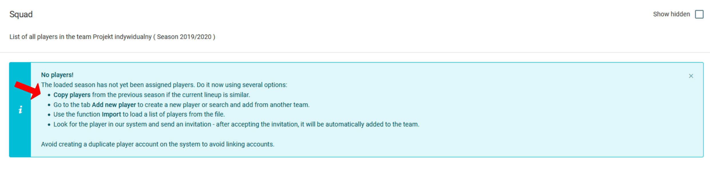 Lai sāktu spēlētāju kopēšanu no iepriekšējās sezonas, lūdzu, noklikšķiniet uz treknrakstā esošā teksta "kopēt spēlētājus", kā parādīts attēlā augstāk, vai noklikšķiniet kreisajā izvēlnē uz dienasgrāmata spēlētāji spēlētāju kopēšana.