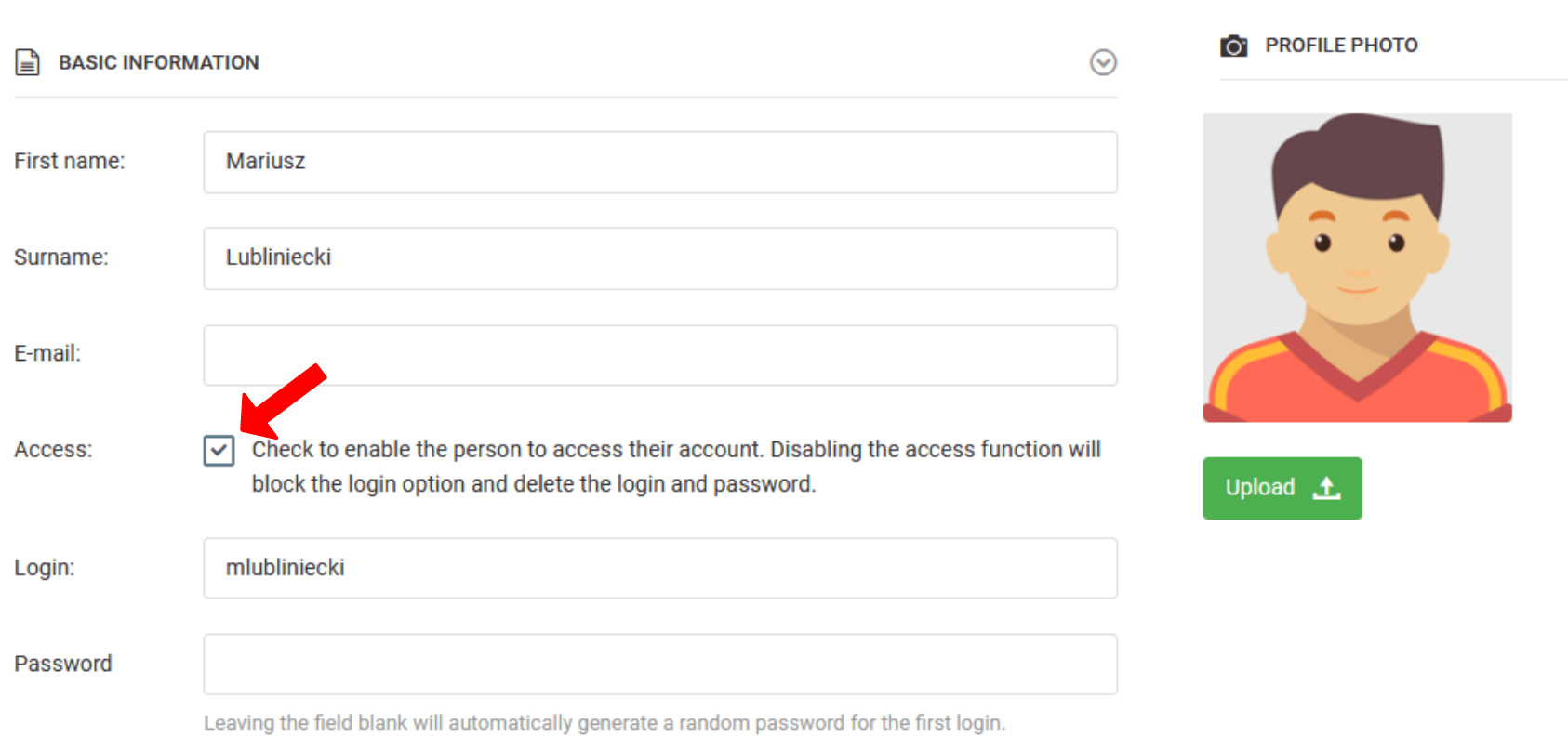 e também poderá alterar dados como nome, sobrenome ou e-mail. A partir daqui, você pode dar acesso ao sistema para o jogador. Basta marcar a caixa de seleção cinza e o sistema gerará um login e senha para o jogador. O perfil também pode ser editado pelo pai do jogador.