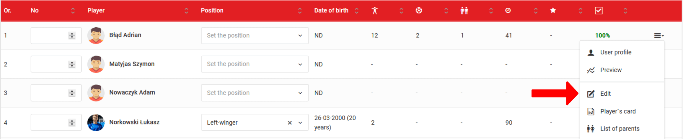 Para editar o perfil de um jogador, clique no item "editar" no menu de funções daquele jogador. A partir daqui, você poderá, por exemplo, adicionar uma foto do jogador,