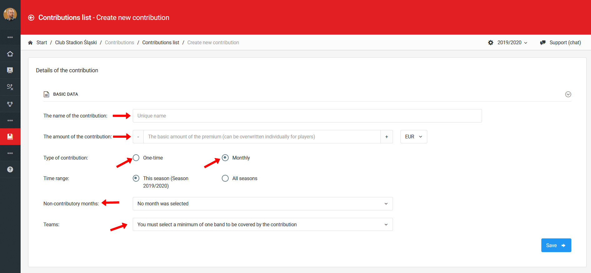 Sistem omogoča ustvarjanje dveh vrst prispevkov: enkraten prispevek in mesečni prispevki. Pred ustvaritvijo prispevkov je dobra vaja, da izpolnite proces postavitve seznama igralcev za vsako ekipo in da ustvarite aktivno sezono za vse ekipe. Brez ustvarjene sezone ne boste mogli prispevka pripisati ekipi. Ustvarjanje prispevka je možno hkrati s stopnje trenerja kot upravnika klubskega računa. Če prispevek ustvarite kot trener, ga lahko dodelite le ekipi, ki jo vodite. Če to naredite kot administrator, lahko ustvarite prispevek za vse ekipe hkrati. Da nadaljujete z ustvarjanjem prispevka kot trener, iz levega menija izberite dnevnik prispevki ustvari nov prispevek. Če želite ustvariti prispevek kot administrator, iz levega menija izberite klub prispevki ustvari nov prispevek.